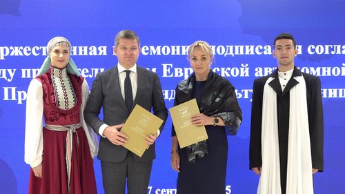 Накануне в Еврейской автономной области работал генеральный директор Президентского фонда культурных инициатив Роман Карманов. Вместе с врио губернатора ЕАО Марией Костюк они открыли в Биробиджане региональный проектный офис ПФКИ и подписали соглашение о сотрудничестве.