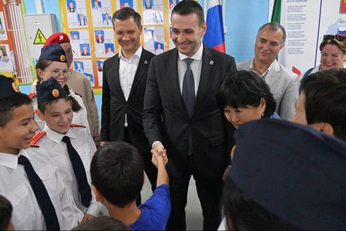 Дмитрий Демешин отметил, что особая задача школы - воспитывать в детях уважение и любовь к своей Отчизне. Так, в холле первого этажа учреждения оформлена выставка детских работ, представленных на муниципальный конкурс детского творчества «Время героев», также на базе школы функционируют объединения патриотической направленности «Юнармия», «Кадеты», с 2025 года налажено взаимодействие с «Движением Первых».
