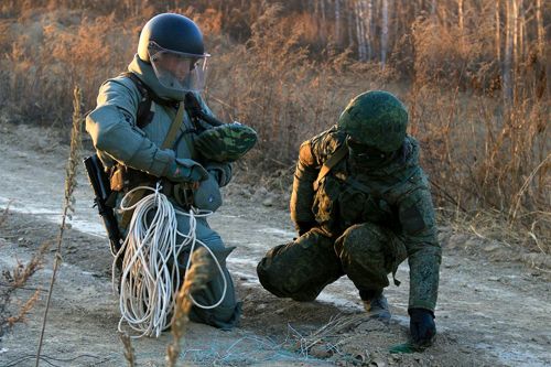 В ходе тренировки военнослужащими также был осуществлен поиск, с использованием современных миноискателей, мин-ловушек, самодельных взрывных устройств, а также замаскированных противотанковых мин и растяжек, заложенных на пути следования военной техники. Для создания обстановки, максимально приближенной к боевой, были применены средства имитации, дымы и холостые боеприпасы.