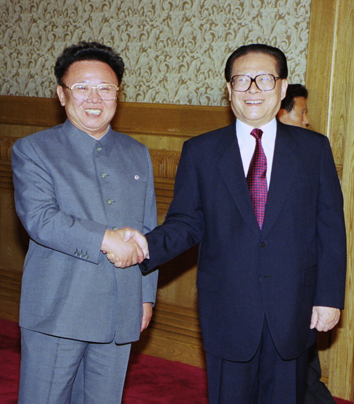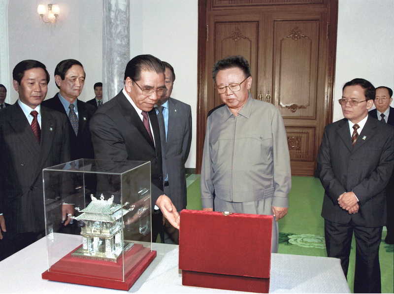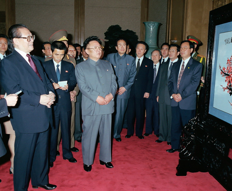 | Ким Чен Ир принимает подарок от Председателя КНР Цзян Цзэминя. Май 2000 года. |