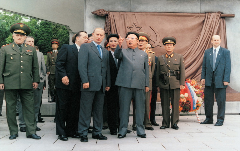 | Ким Чен Ир вместе с Президентом РФ Владимиром Владимировичем Путиным любуется панорамой г. Пхеньяна с Монумента освобождения. Июль 2007 года. |