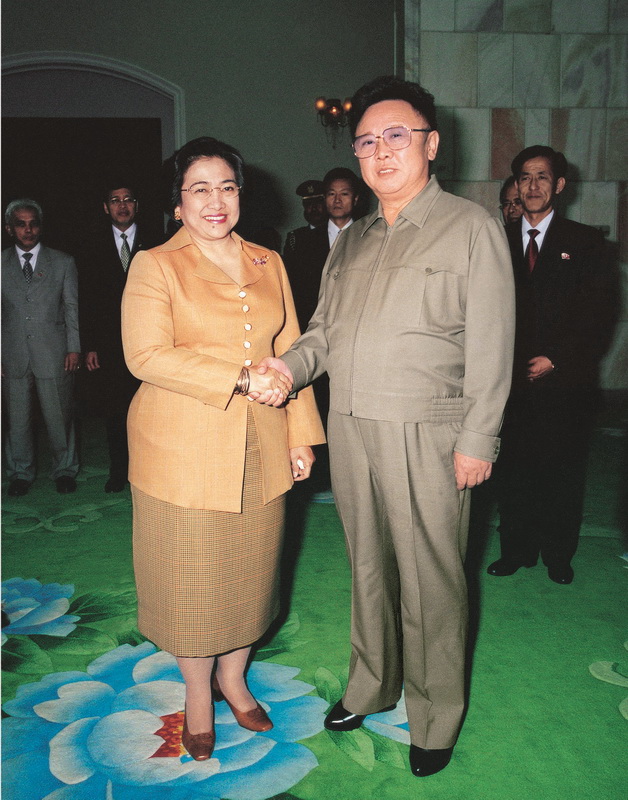 | Ким Чен Ир получает подарок от Президента Республики Индонезия Мегавати Сукарнопутри. Март 2002 года. |