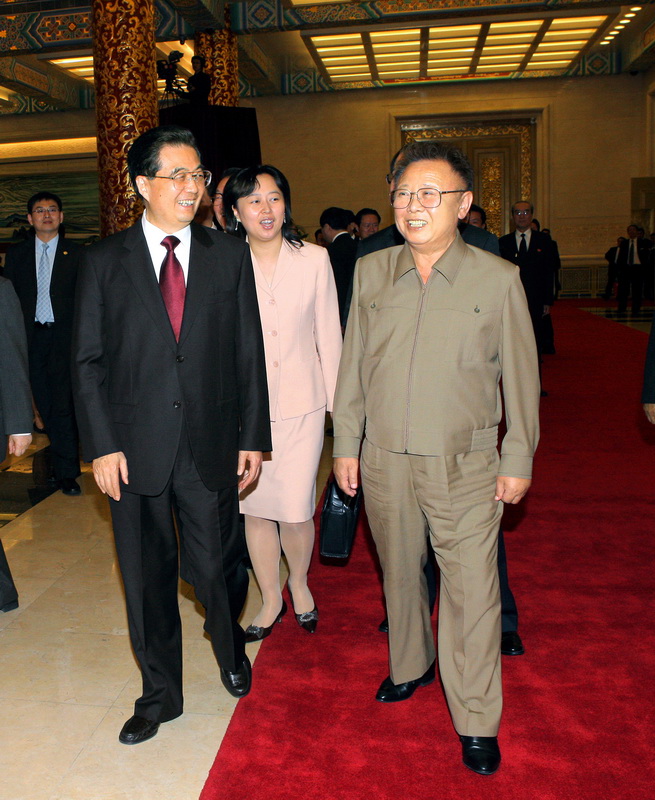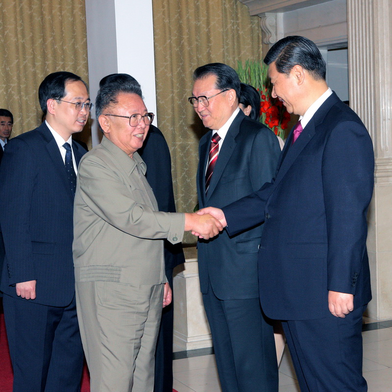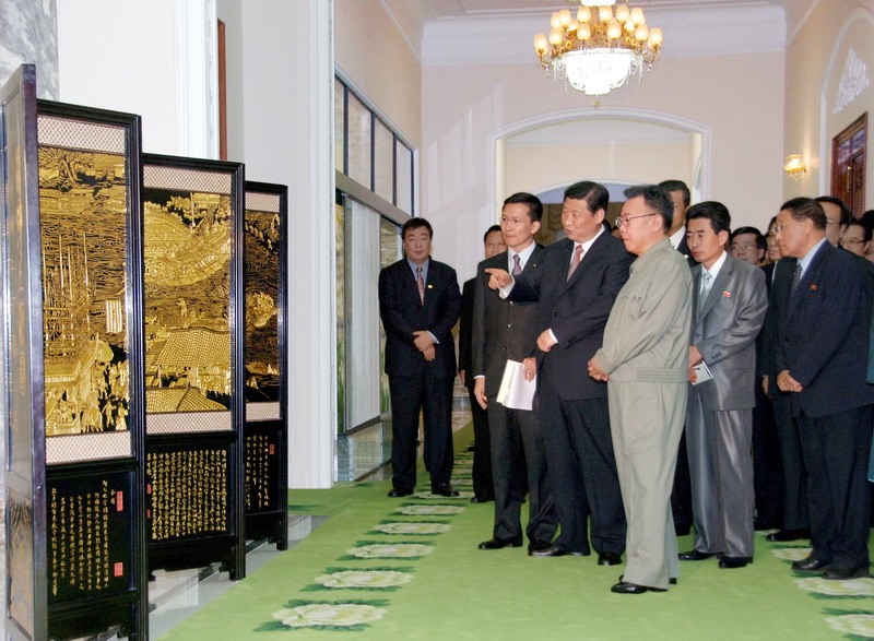 | Ким Чен Ир получает подарок от заместителя Председателя КНР Си Цзиньпина. Июнь 2008 года. |