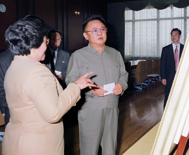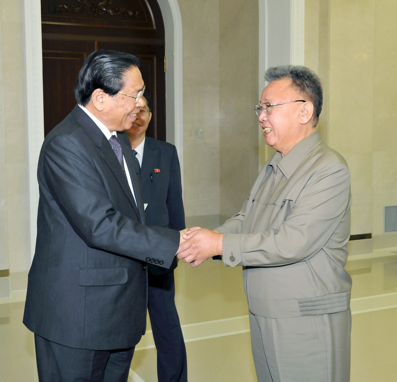 | Ким Чен Ир принимает подарок от короля Камбоджи Нородом Сианука. Июль 2004 года. |