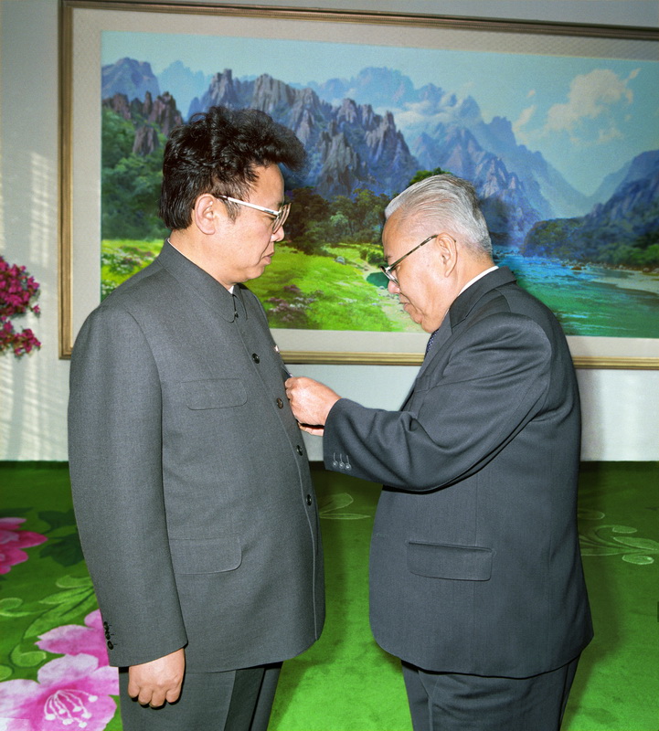 | Ким Чен Ир получает орден от короля Камбоджи Нородом Сианука. Июль 2004 года. |