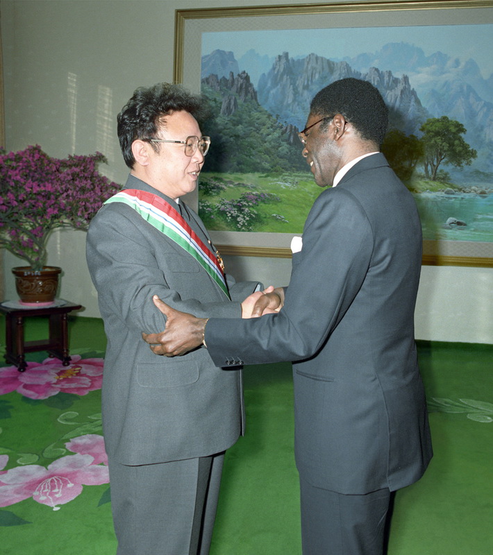| Ким Чен Ир получает орден от Президента Республики Экваториальная Гвинея Обианг Нгема Мбасого. Апрель 1992 года. |
