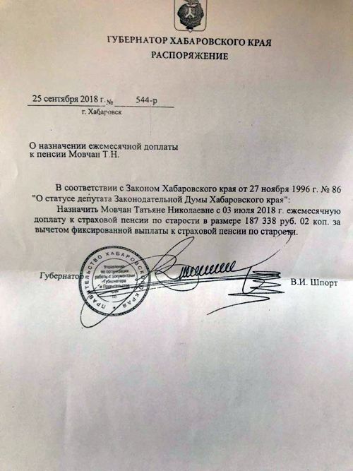 Но самое великое достижение «почетного пенсионера Хабаровского края» состоит в том, что в стройной когорте краевых единороссов Мовчан проголосовала за повышение пенсионного возраста.