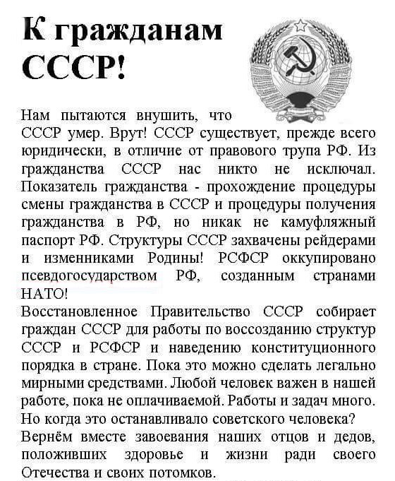Но ничего из этого не было сделано, патриоты СССР с большой легкостью избавились от «серпастого и молоткастого» советского паспорта и на третьем десятке лет после кончины СССР чудики вдруг решили, что они граждане этого несуществующего государства.