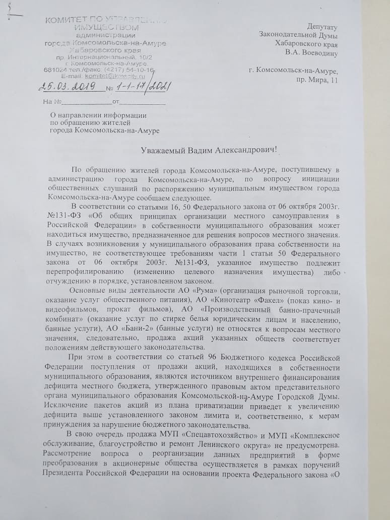 Есть ещё один любопытный (или смешной) момент в письме замглавы города М.Ермакова. Он сообщает, что два предприятия – МУП "Спецавтохозяйство" и МУП "КОБР ЛО" – администрация и не собирается продавать, а лишь рассматривает вопрос об их реорганизации на основании ПРОЕКТА Федерального закона "О внесении изменений в отдельные законодательные акты РФ" (дату и номер проекта ФЗ не указывают). Мы пониманием, о каком законопроекте идет речь. Он принят в первом чтении Госдумой в декабре 2018 года. Однако, спикер Совета Федерации В. Матвиенко заявила, что Совфед этот законопроект не поддержит. О чём тогда нам говорит начальник комитета по управлению имуществом города М. Ермаков?! К тому же, в этот законопроект 19 марта 2019 года внесены поправки про районы Крайнего Севера и приравненные к нему местности, в которых будет запрещена реорганизация МУПов, обеспечивающих жизнедеятельность населения (в том числе предоставление коммунально-бытовых услуг). Так что в этом плане ещё всё вилами на воде написано.