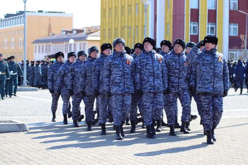 Продолжилось мероприятие на главной площади столицы торжественным маршем в составе войск Анадырского гарнизона. Колонну росгвардейцев возглавил подполковник Алексей Баранов.