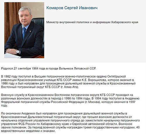 Полковнику Сергею Комарову 52 года, до гражданской службы он успел послужить в погранвойсках КГБ СССР и ФСБ РФ (был замначальника по кадрам пограничного управления ФСБ России по Хабаровскому краю и ЕАО).