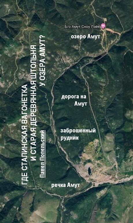 После публикаций в МД ко мне обратилась женщина-турист, которая регулярно ездила на Амут и слышала о торчащей по дороге к озеру Опрокинутой Вагонетке, о деревянной старой штольне и какой-то старой вышке с бараками на пути к озеру. Об этом я рассказал в ТОЗе.
