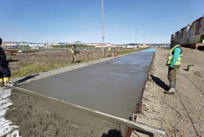 Работы по ул. Колхозная начались 7 июля. Завершен подготовительный этап работ, произведена отсыпка и армирование, установлена опалубка, а сегодня, 23 июля подрядчик ООО «Чукотстройинвест» приступил к укладке нового бетонного покрытия толщиной в 20 сантиметров.