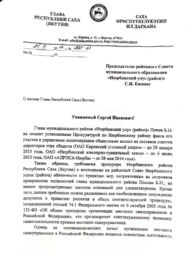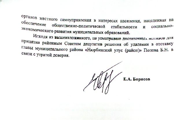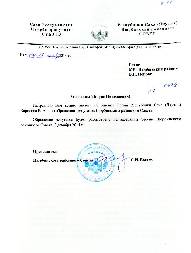 27 ноября председатель Нюрбинского районного совета Сергей Евсеев направил копию письма «О мнении главы Республики Саха (Якутия)» главе района Борису Попову.