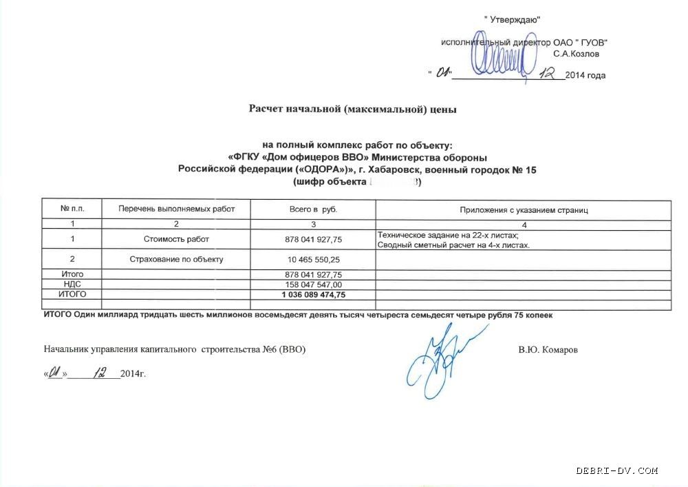 Расчет всех работ в «Доме офицеров» по начальной (минимальной) цене обойдется в 1 млрд 36 млн 89 тыс. рублей. Дата окончания конкурса - 12 января 2015 года.