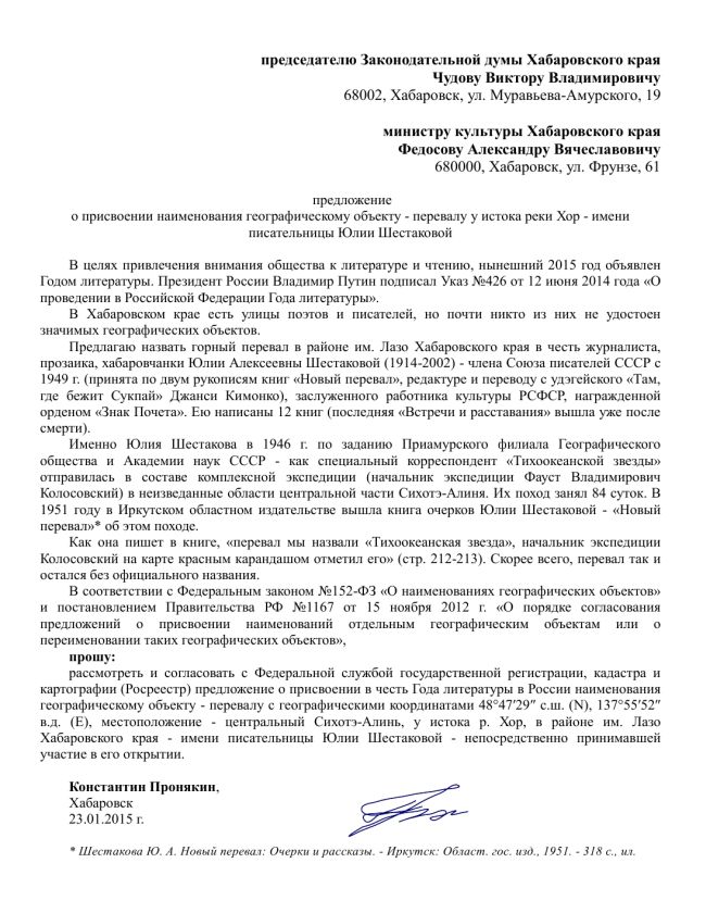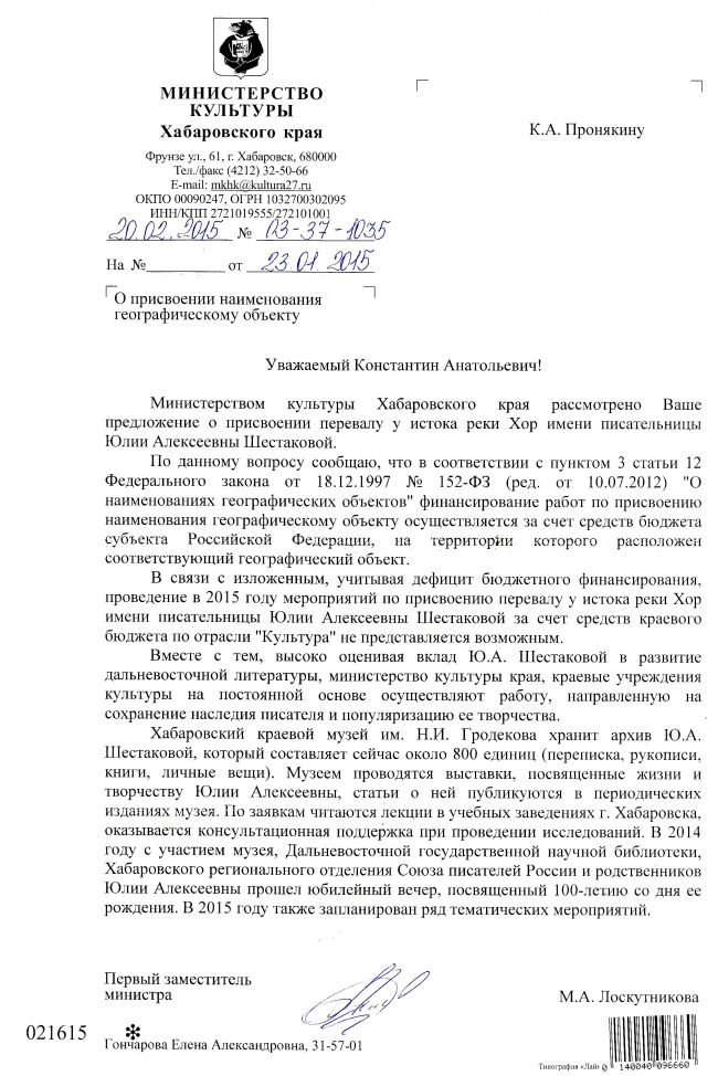 Обратившись 23 января 2015 года с предложением о присвоении наименования географическому объекту - перевалу у истока реки Хор - имени писательницы Юлии Шестаковой в министерство культуры Хабаровского края, я получил ответ от 20 февраля 2015 года за №03-37-1035 (конверт со штемпелем от 04.03.15 г.) и за подписью первого заместителя министерства культуры края М.А. Лоскутниковой.