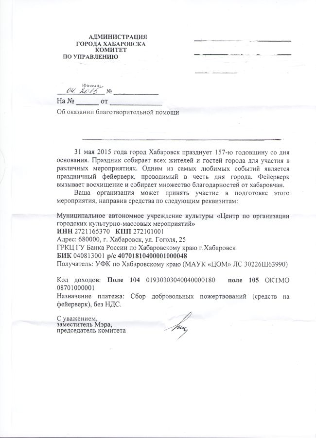 Вот текст письма: «31 мая 2015 года город Хабаровск празднует 157-ю годовщину со дня основания. Праздник собирает всех жителей и гостей города для участия в различных мероприятиях. Одним из самых любимых событий является праздничный фейерверк, проводимый в честь дня города. Фейерверк вызывает восхищение и собирает множество благодарностей от хабаровчан. Ваша организация может принять участие в подготовке этого мероприятия, направив средства по реквизитам».