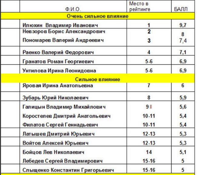 Группу политиков, имеющих в регионе сильное влияние, возглавляет депутат Государственной Думы РФ, председатель Комитета по безопасности и противодействию коррупции Яровая Ирина Анатольевна (6 баллов).