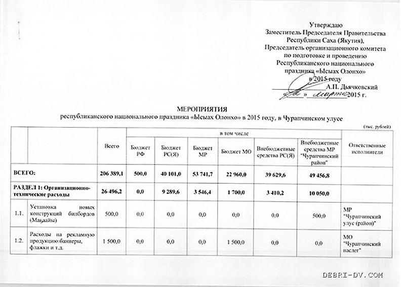 Республиканский Минмол, готов заплатить организаторам Молодежного Ысыаха в селе Мегино-Алдан Томпонского района - 688 тысяч рублей. За эти день организатор должен обеспечить молодежь: 2 ведущими, 16 артистами, 2 танцевальными и 2 вокальными коллективами и привести массовку не менее 700 человек.