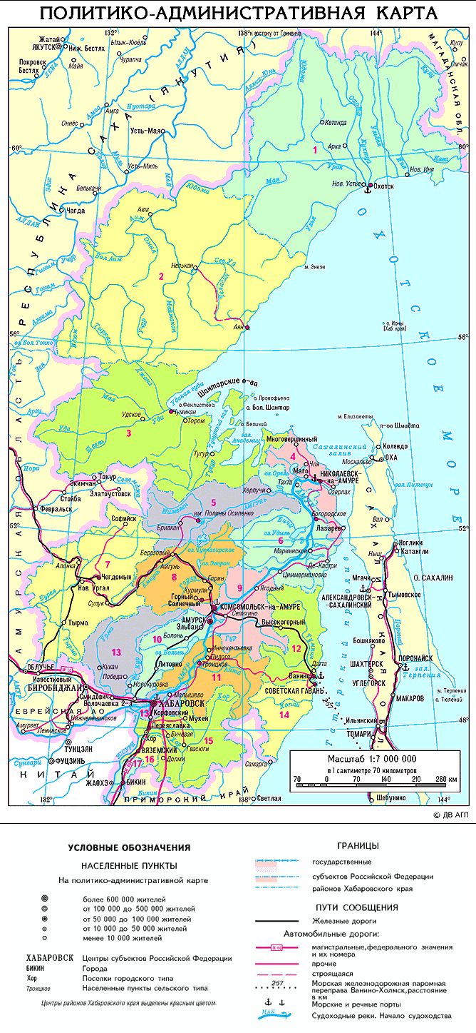 Крупнейшие города – административная столица края г. Хабаровск (577,4 тыс.жителей), г. Комсомольск-на-Амуре (271,6 тыс.жителей).