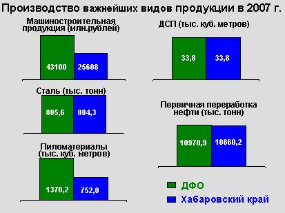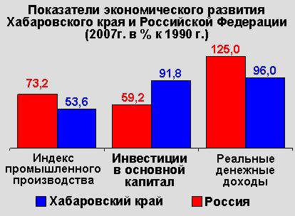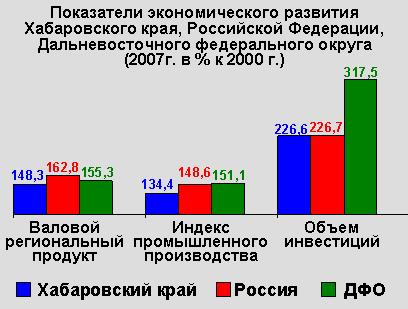 В 2006 году валовой региональный продукт Хабаровского края составил 196,2 млрд.рублей, темп роста его реального объема к уровню 2005 года – 105,3 процента. В 2007 году сохранялась тенденция роста экономики края, по оценке валовой региональный продукт составил более 230 млрд.рублей с ростом 107,0 процентов к уровню 2006 года. Среднегодовой темп роста за период 2001-2007 годы составил 105,8 процента.