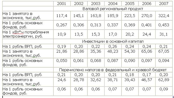 За период 2001-2007 годы количество занятых в экономике увеличилось на 52,2 тыс.человек, выработка на одного занятого в экономике края возросла в 2,7 раза, на 1 рубль основных фондов – в 1,7 раза, на 1 кВт/ч потребления электроэнергии – 2,9 раза.