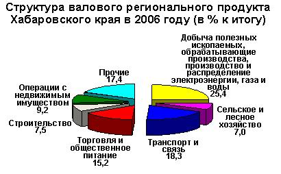 В структуре валового регионального продукта Хабаровского края (ВРП) основное место занимает добыча полезных ископаемых, обрабатывающие производства и производство и распределение электроэнергии, газа и воды (25,4%) в 2006 году, 18,3 процента приходится на транспорт и связь, 15,2 процента – на торговлю и общественное питание, сельское и лесное хозяйство - 7,0 процента, строительство – 7,5 процента, операции с недвижимым имуществом, аренда и предоставление услуг – 9,2 процента, другие виды экономической деятельности - 17,4 процента.