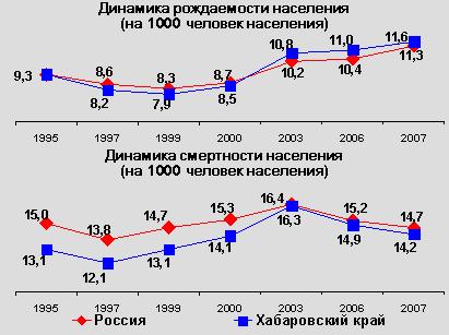 Продолжительность жизни населения Хабаровского края в 2006 году составила 63,67 лет, в России - 66,6 лет, в ДФО - 63,87 лет.