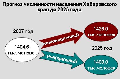 Прогноз социально-экономического развития Хабаровского края до 2025г. разработан по двум сценариям: инерционному и инновационному. Инерционный сценарий представляет собой ответ на вопрос, что будет с экономикой Хабаровского края, если внешние условия, структура экономики и экономическая политика останутся неизменными.