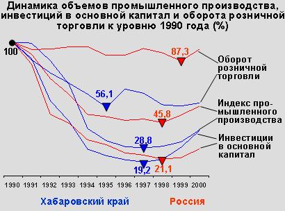 В 2006 году в структуре формирования ВРП Хабаровского края около 42 процентов занимали отрасли производящие товары, 58 – отрасли производящие услуги (по Российской Федерации эти показатели составляют 45,6 и 54,4 процента соответственно). При этом с 2000г. прослеживается тенденция уменьшения доли отраслей, производящих товары, в том числе за счет промышленного производства и увеличение доли отраслей, производящих услуги. Такая же тенденция присуща и российской экономике в целом, но в российской экономике доля отраслей, производящих товары, в ВВП выше, чем в Хабаровском крае, а главное, не происходит снижения доли промышленного производства в формировании ВВП. При сохранении этих тенденций, учитывая уже имеющиеся инфраструктурные и транспортные проекты, ситуация в Хабаровском крае в долгосрочной перспективе будет выглядеть так: рост доли отраслей, производящих услуги, в том числе и за счет увеличения доли транспорта и уменьшение доли промышленного производства, в том числе обрабатывающих отраслей.