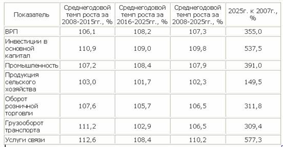 При развитии по инновационному сценарию основой развития экономики края остается промышленное производство, при этом предполагается перестройка структуры промышленности, формирование высокотехнологичных и среднетехнологичных производств, производящих продукцию высокой степени переработки. Изменения затронут деревообработку, металлургический комплекс, машиностроение, как гражданское, так и военное, нефтепереработку, планируется создание нефтехимии и газохимии в крае. Это позволит обеспечить уже до 2015г. среднегодовые темпы роста промышленности 107,2%, а общее увеличение промышленного производства в 2025 году к уровню 2007 года составит 3,9 раз. В случае комплексного развития промышленности края станет возможным дополнительный рост транспортного и торгового обслуживания, связи. Высокие тепы роста промышленности и производственной инфраструктуры потянут за собой развитие социальной инфраструктуры, что в целом обеспечит дополнительные темпы прироста ВРП. Основные показатели развития отраслей экономики Хабаровского края по двум сценариям приведены в таблице 6.