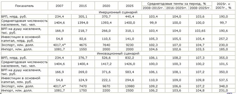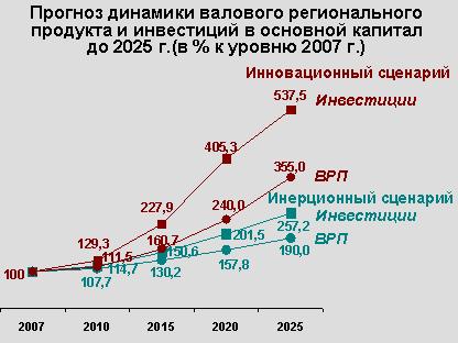 Что касается экспорта и импорта, то инерционный сценарий предполагает увеличение экспорта в 2025г. относительно 2007г. в 2,3 раза, импорта в 1,9 раз. Инновационный сценарий предполагает более быстрые темпы роста экспорта и импорта и соответственно увеличение экспорта в 2025 относительно 2007г. прогнозируется в 3,5 раза, импорта – в 2,3 раза. В структуре экспорта в обоих сценариях увеличится доля цветной металлургии, продукции машиностроения. В инновационном сценарии ставка делается на экспорт нефтепродуктов, продуктов нефтегазохимии, продукции лесопереработки, продукции машиностроения (в том числе самолетов и судов), электроэнергии.