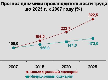В обоих случаях при прогнозе закладывается рост производительности труда в экономике края, но в инерционном сценарии производительность будет расти со среднегодовым темпом 103,1% и в 2025г. производительность труда относительно 2007г. вырастет в 1,7 раза. По инновационному сценарию производительность труда будет расти со среднегодовым темпом 106,7%, а рост производительности труда в 2025г. относительно 2007г. составит 3,2 раза, что в 1,9 раза превышает показатели инерционного сценария.