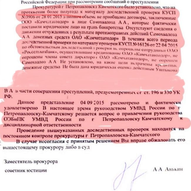 По результатам проведенной проверки, 21 сентября с.г. отделом дознания УМВД России по Петропавловску-Камчатскому вынесено решение об отказе в возбуждении уголовного дела, в связи с отсутствием в деянии Уштыкова признаков состава преступления (точно по таким же доводам оказывали в возбуждении дела в отношении г-на Самохвалова).