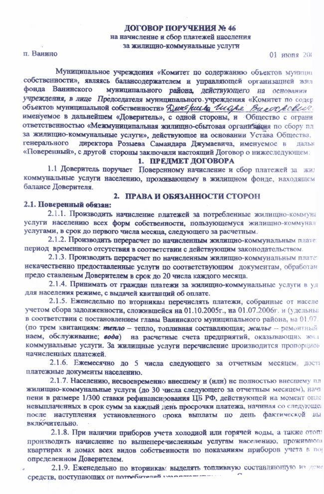 Так вот согласно договору №46 от 1 июня 2009 г. «Доверитель» - МУ «Ксомс» поручает «Поверенному» - ООО «Жилкомсбыт» начисление и сбор платежей за жилищно коммунальные услуги населению. И только…