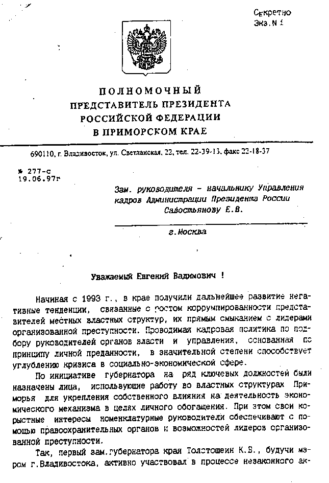 ционирования и приватизации муниципальной собственности. Фактически за бесценок осуществил беспрецедентную по размерам аферу с продажей крупнейшего гостиничного предприятия «Владивосток», в контакте с лидером организованной преступности Алексеенковым, фирме «Амис и Ко». По оценкам специалистов биржи, гостиница стоимостью в 40 млрд.руб., была реализована за 127 млн.руб. В качестве оплаты «за услугу», несовершеннолетняя дочь Толстошеина получила 20%. пакет акций фирмы «Амис и Ко».