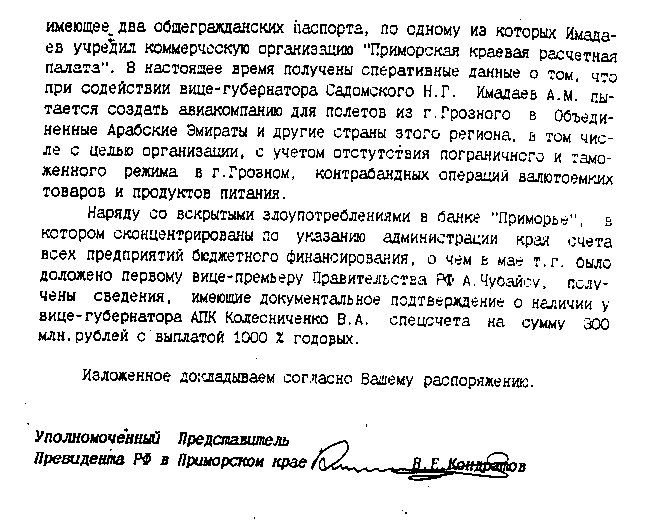Как свидетельствуют предварительные результаты проведенных в т. г. УФСБ совместно с КРУ Минфина встречных проверок предприятий-поставщиков нефтепродуктов, в течение отопительных сезонов -1995-96гг и 1996-97 гг происходила недопоставка топлива ежегодно более чем на 100 млрд.руб. При этом деятельность нынешних руководителей Департамента по жилищно-коммунальному хозяйству и Комитета по топливным ресурсам - Чепика В.Г. и Зорина С.Б. контролируется непосредственно губернатором.