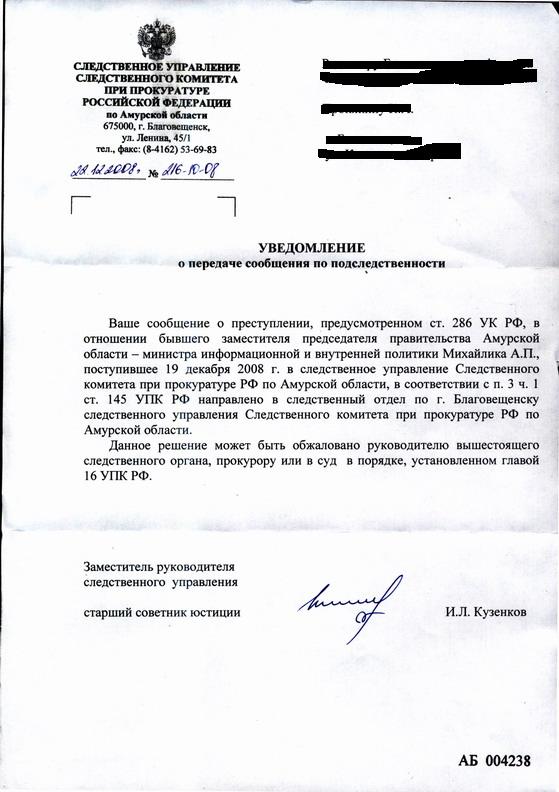 Ваше сообщение о преступлении, предусмотренном ст. 286 УК РФ, в отношении бывшего заместителя председателя правительства Амурской области — министра информационной и внутренней политики Михайлика А. П., поступившее 19 декабря 2008 г. в следственное управление следственного комитета при Прокуратуре РФ по Амурской области, в соответствии с п. 3 ч. 1 ст. 145 УПК РФ направлено в следственный отдел по г. Благовещенску следственного управления Следственного комитета при прокуратуре РФ по Амурской области.
