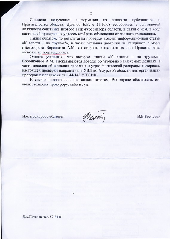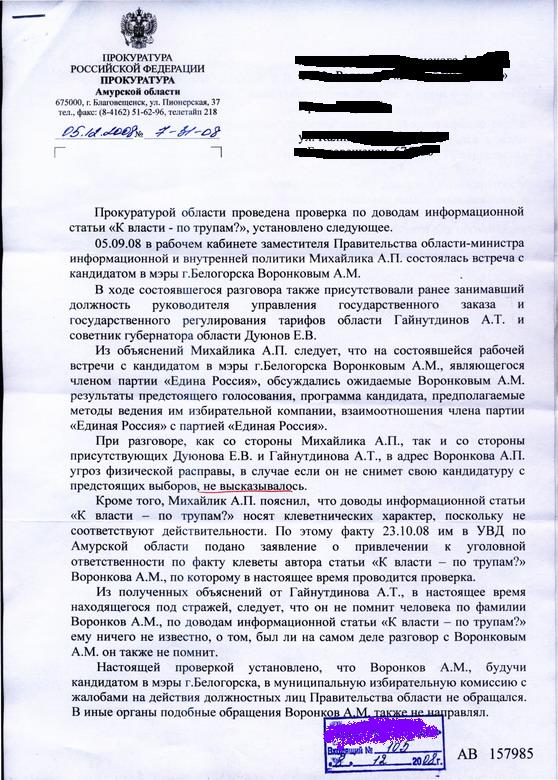 Однако учитывая, что автором статьи «К власти по трупам?» Воронковым А. М. высказываются доводы об уголовно наказуемых деяниях, в части доводов об оказании давления и угроз физической расправы, материалы настоящей проверки направлены в УВД по Амурской области для организации проверки в порядке ст.ст. 144-145 УПК РФ.