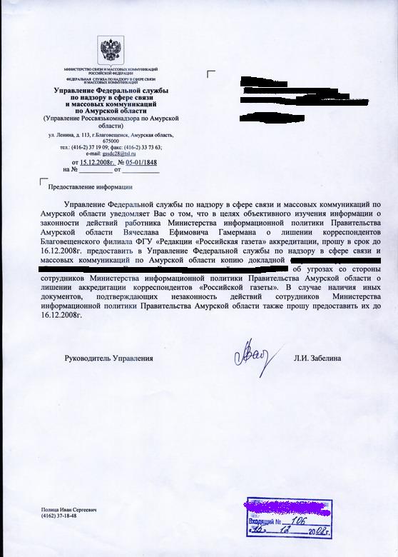 Управление Федеральной службы по надзору в сфере связи и массовых коммуникаций по Амурской области уведомляет Вас о том, что в целях объективного изучения информации о законности действий работника Министерства информационной политики Правительства Амурской области Вячеслава Ефимовича Гамермана о лишении корреспондентов Благовещенского филиала ФГУ «Редакции «Российская газета» аккредитации, прошу в срок до 16.12.2008 г. предоставить в Управление Федеральной службы по надзору в сфере связи и массовых коммуникаций по Амурской области копию докладной … об угрозах со стороны сотрудников Министерства информационной политики Правительства Амурской области о лишении аккредитации корреспондентов «Российской газеты».