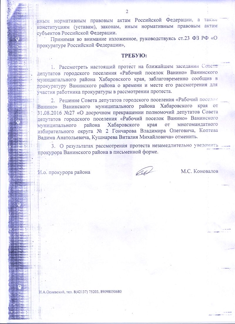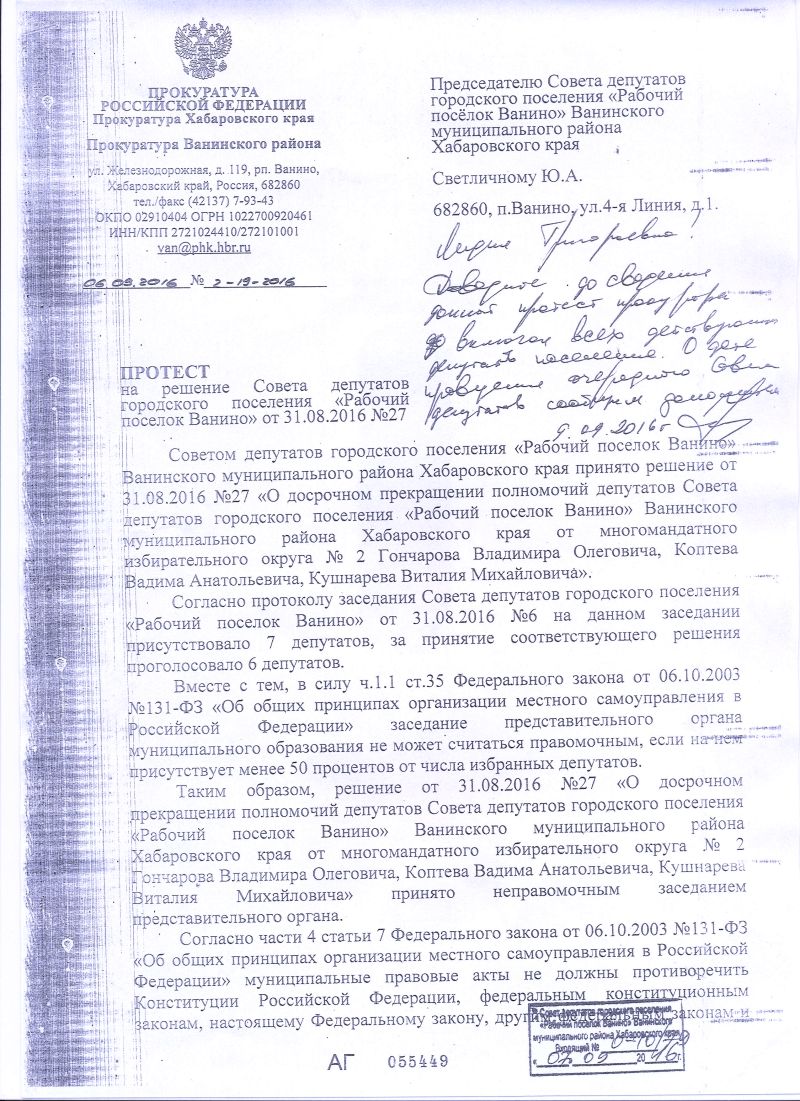 - Все решения Совета депутатов п. Ванино, начиная с июня 2015 годна - не легитимны, 11 решений, начиная с 3 марта 2016 года - тоже будут отменены, но уже по решению прокуратуры Ванинского района. Один протест от прокуратуры уже поступил в Совет на решение от 31 августа с.г., со ссылкой, что действие Совета не легитимно из-за отсутствия кворума (6 чел.), таким образом, решение Совета - незаконно и подлежит отмене.