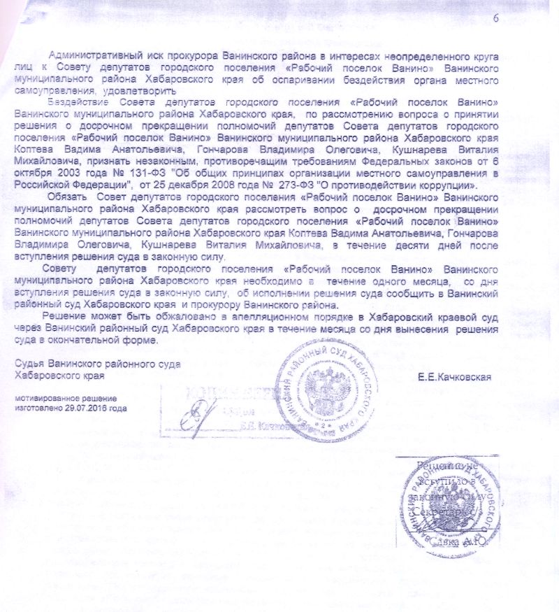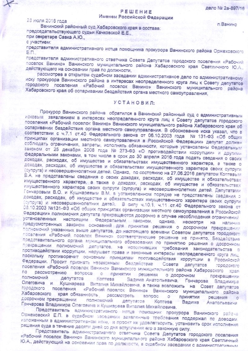 Согласно решению суда, признано незаконным бездействие Совета депутатов п. Ванино с требованием досрочного прекращении полномочий депутатов не подавших декларацию о доходах - Коптева, Гончарова, Кушнарева, как противоречащим требованиям Федеральных законов №131 «Об общих принципах организации местного самоуправления в РФ» и №273 «О противодействии коррупции».
