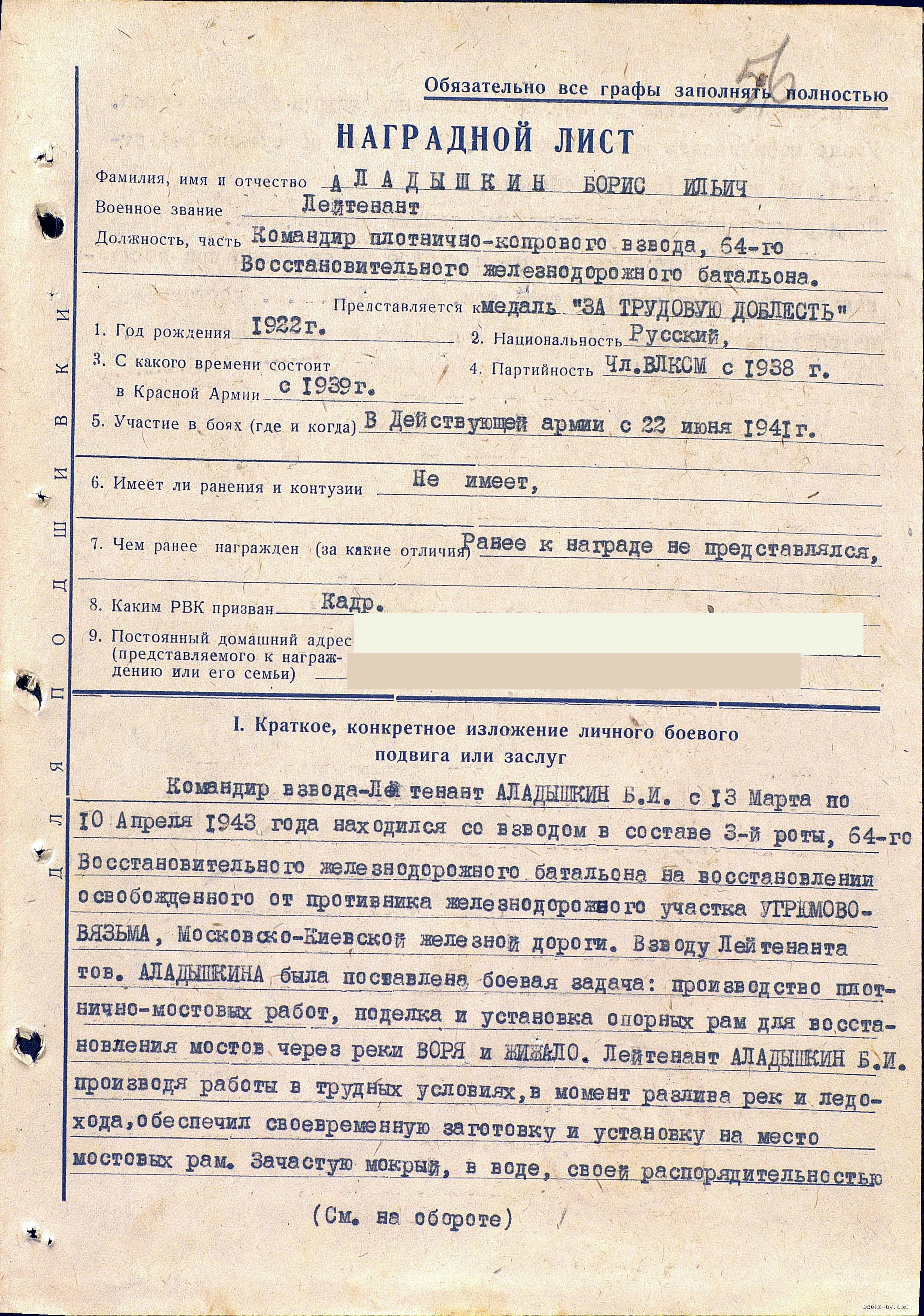 Майор Аладышкин Борис Ильич (1922 - 16.10.1952). Родился в г. Павлов-на-Оке Горьковской области. Поступил на службу в 1939 году. Прошел войну, начинал командиром плотнично-копрового (сваебойного) взвода 64-го восстановительного железнодорожного батальона 1-я железнодорожной бригады. Награжден медалью «За боевые заслуги» (№6/н от 25.04.1943 г.). Представлялся к медали «За трудовую доблесть». Все эти данные оцифрованы в ЦАМО (см. Ф.33. Оп.682526. Ед.хр. 1153. № зап. 16808172).