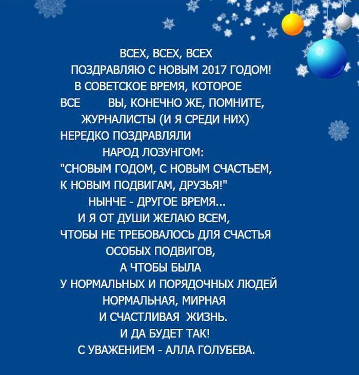 Дорогие друзья! Новый, 2017 год, будет таким, каким мы сделаем его сами. Пусть свершится всё задуманное и долгожданное. Я благодарю каждого из вас за вашу сплоченность, за всё, чего мы добились вместе. От всей души желаю вам успехов, счастья, крепкого здоровья и семейного благополучия! С праздником!