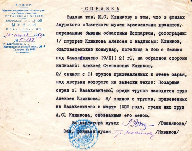 После казни коммунистов, белоповстанцы продолжили свой путь. Жители Казакевичево проявили человечность, собрали трупы и отнесли их в село, где сложили в пожарный сарай. Судя по акту осмотра, который был составлен 15 марта 1922 года, я его уже приводил ранее, пленным были нанесены не по одному удару шашками, да и не только шашками.
