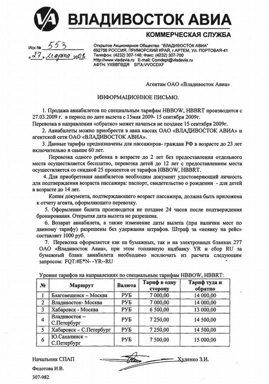 Почему же учащиеся и пенсионеры Комсомольска, вылетая с местного аэропорта, не смогут воспользоваться на общих правах «народными тарифами», уже известными под кодами HBBOW и HBBRT? Ведь по официальной информации с 28 мая 2009 года компания «Владивостокавиа» возобновляет  рейс «Владивосток - Комсомольск-на-Амуре – Москва».