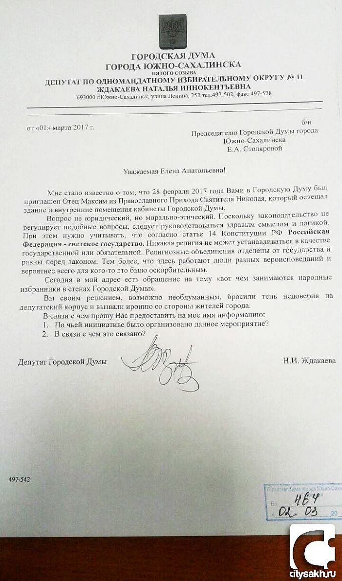 Возможно именно сейчас возникла необходимость передать в пользование аппарату городской Думы экземпляр Конституции Российской Федерации, день принятия которой широко празднуют российские граждане ежегодно, 12 декабря. Именно в этой книге заявлено: Российское государство - светское и на работу его органов не должно сказываться влияние религии. В том числе, религия не должна оказывать влияние на работу должностных лиц органов государственной власти.
