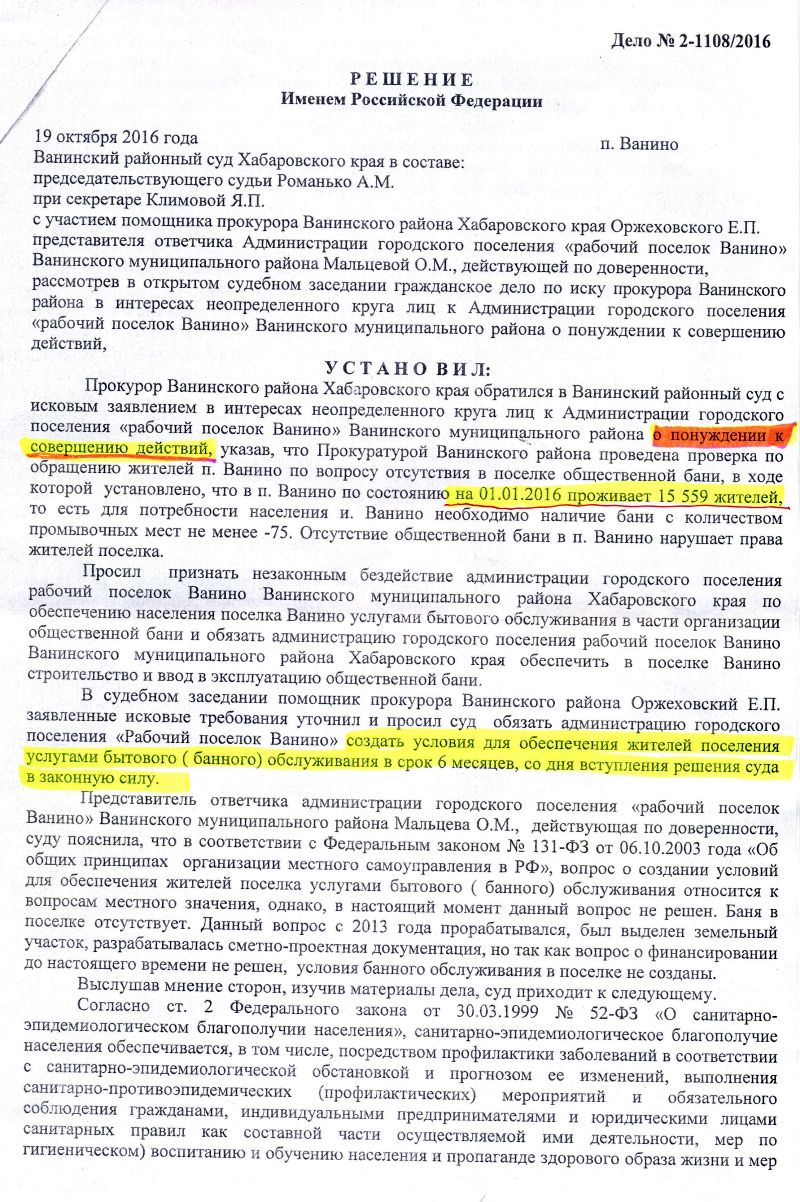 И вот что получилось. Прокуратура района в интересах жителей обратилась в суд с иском о предоставлении администрацией поселка Ванино банных услуг. Следуя ФЗ-131 «Об общих принципах организации местного самоуправления», предоставление банных услуг является полномочиями поселка. Суд поддержал иск прокуратуры, но администрация поселка не согласилась с решением, обжаловала его, и проиграла.