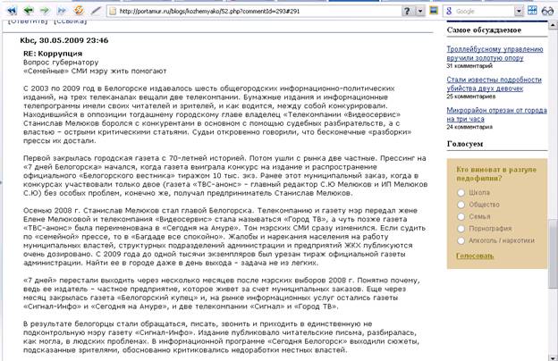 В результате белогорцы стали обращаться, писать, звонить и приходить в единственную не подконтрольную мэру газету «Сигнал-Инфо». Издание публиковало читательские письма, разбиралась, как могла, в людских проблемах. В информационной программе «Сегодня Белогорск» выходили сюжеты, подсказанные зрителями, обоснованно критиковались недоработки местных властей.