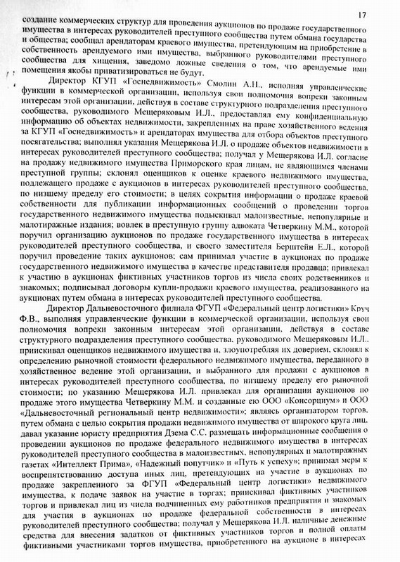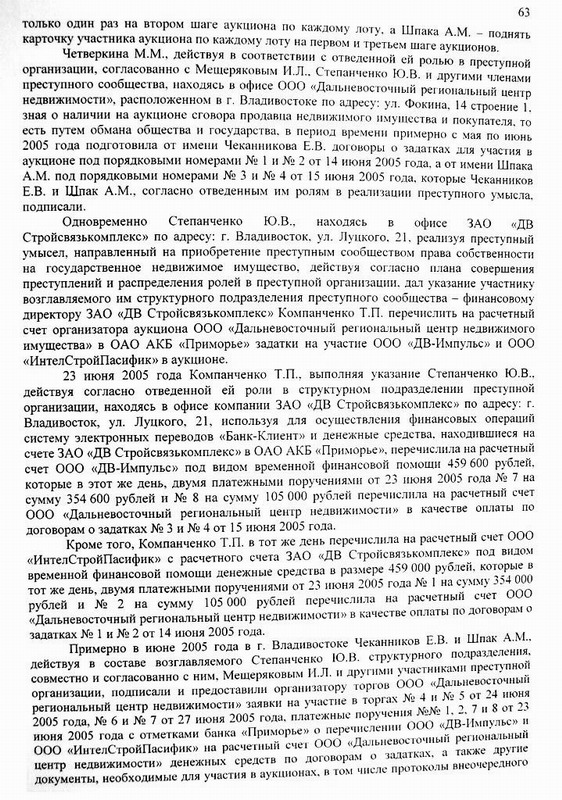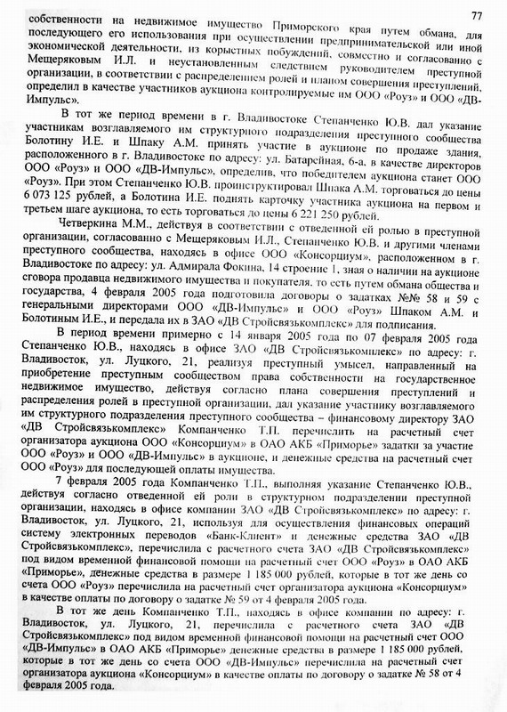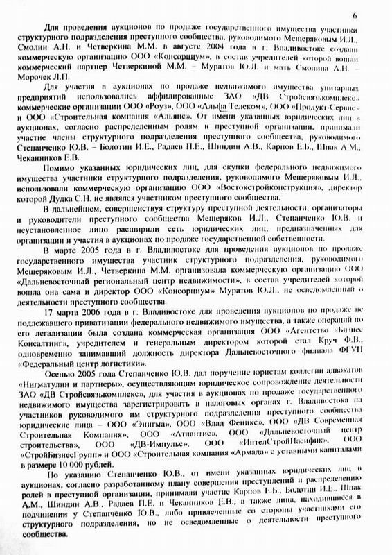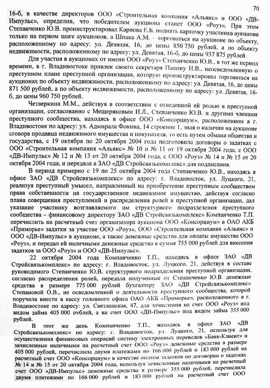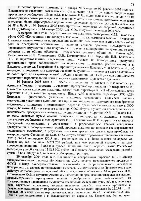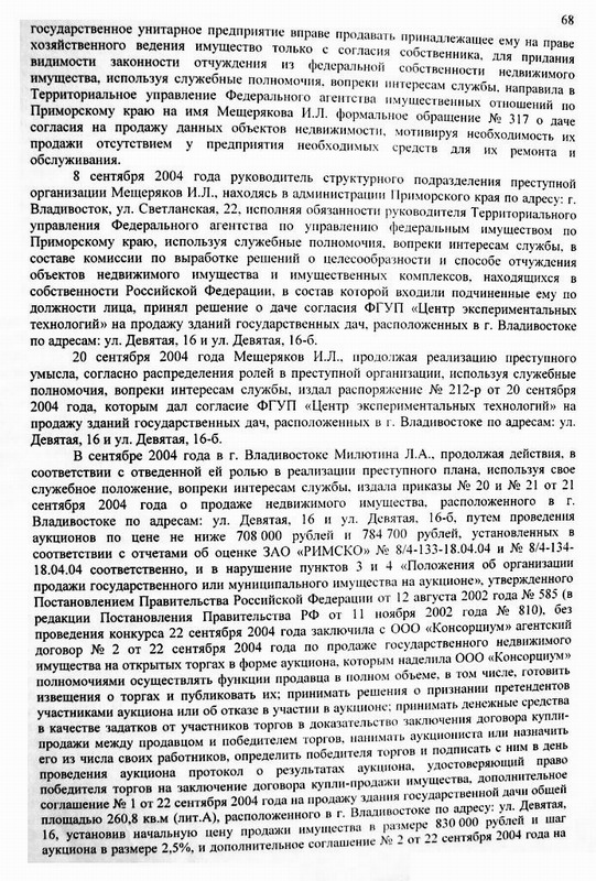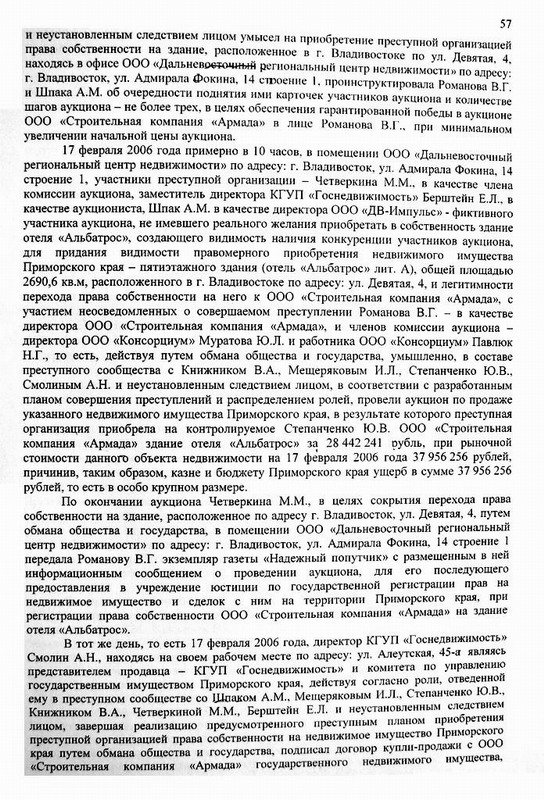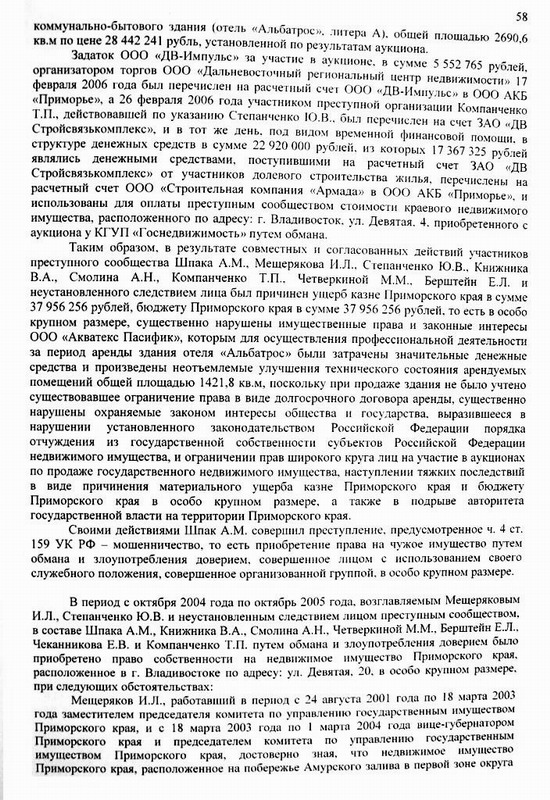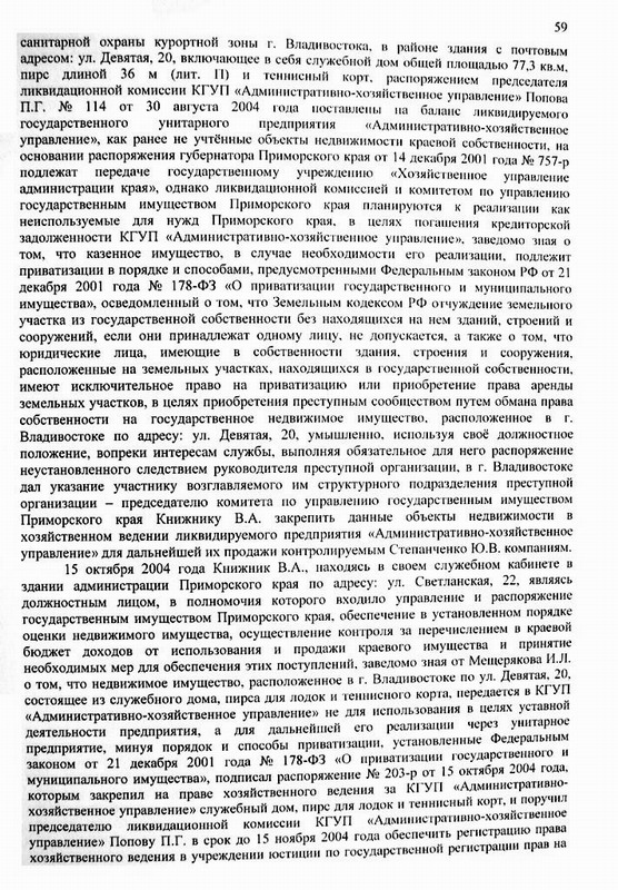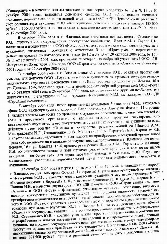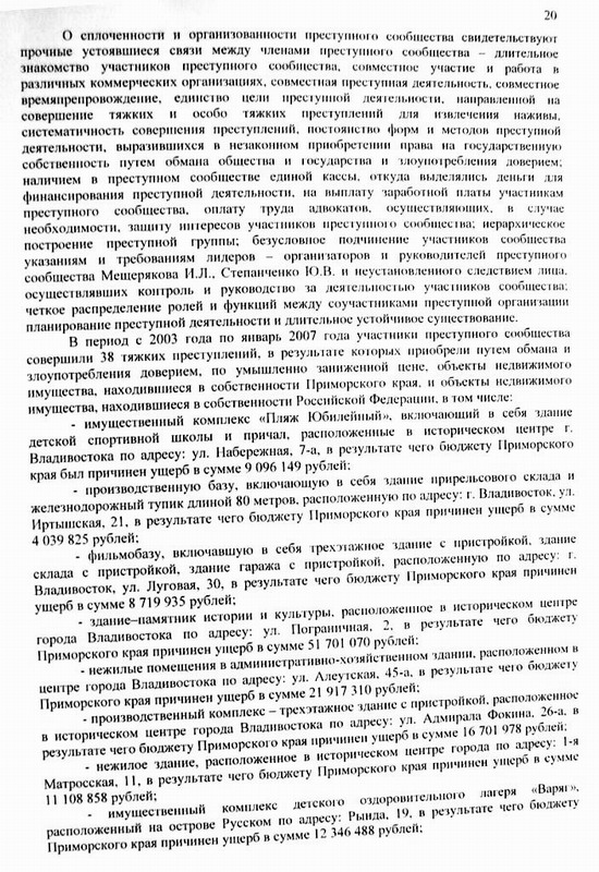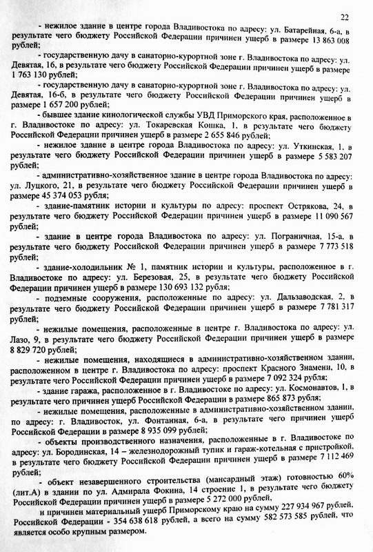 Вот общая суть дела: «В период с 2003 года по январь 2007 года участники преступного сообщества совершили 38 тяжких преступлений, в результате которых приобрели путем обмана и злоупотребления доверием, по умышленно заниженной цене объекты недвижимого имущества, находящиеся в собственности Приморского края, и объекты недвижимого имущества, находящиеся в собственности Российской Федерации (следует полный список объектов – на три листа), и причинен материальный ущерб Приморскому краю на сумму 227 934 967 рублей, Российской Федерации – 354 639 618 рублей, а всего на сумму 582 574 585 рублей, что является особо крупным размером».